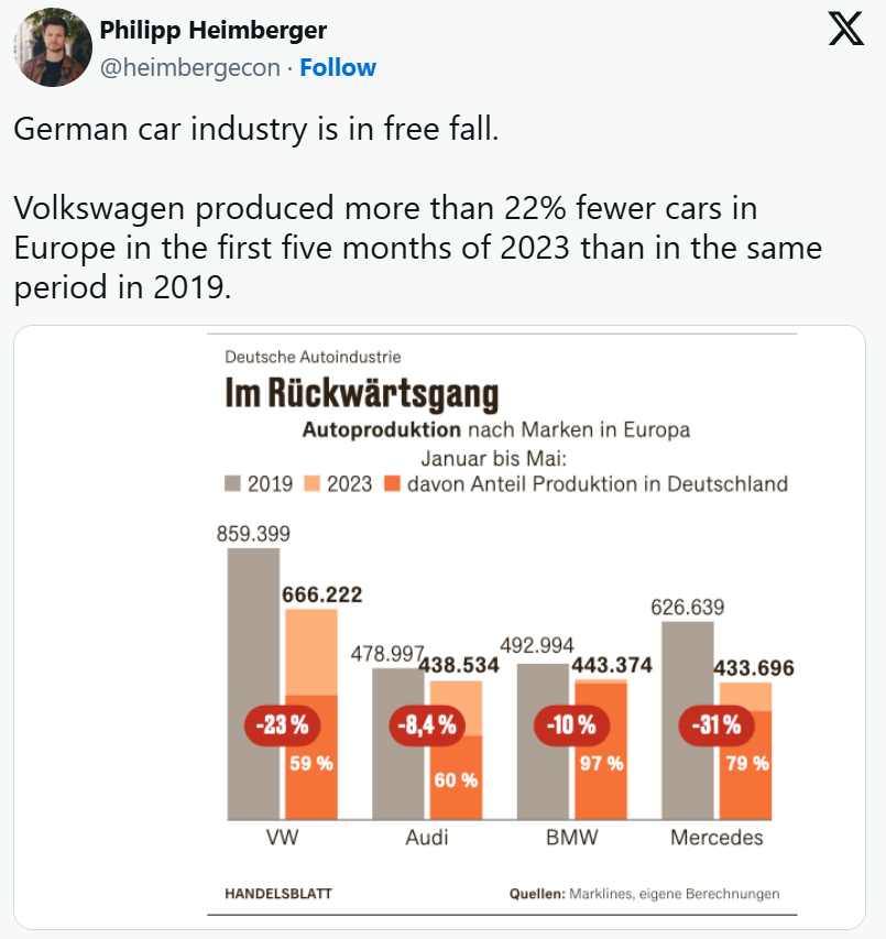- Recession at home. Germany’s broader economy remains in a slump, with the auto sector dragging down GDP. Volkswagen and others are cutting thousands of jobs.
