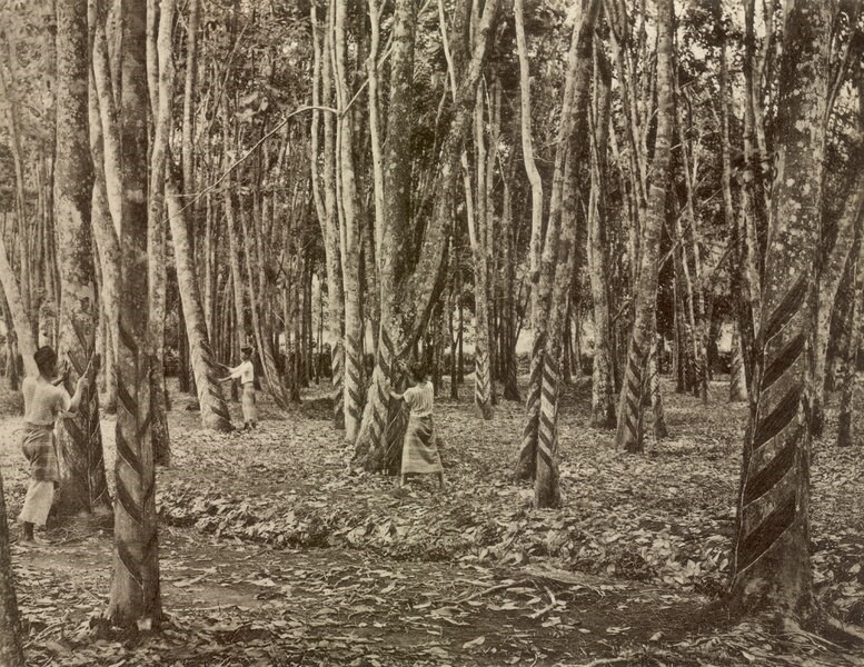 Malayan peasants tapping rubber trees at a plantation.